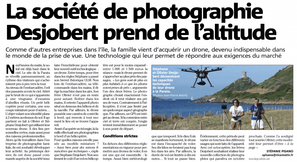 Non classéCorse Matin : La société de photographie Desjobert prend de l’altitude Publié le 11 août 20146 mars 2017 par Jean-Luc Ricco 11 Août Jean-Luc Ricco Corse Matin : Des drones dans le ciel Ajaccien Hôtel Le golfe & Spa Casanera à Porto-Pollo
